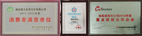 公司先后被金融機構(gòu)評為AAA企業(yè),被湖北省工商局評為“守合同重信用”企業(yè),湖北省科技廳評為“具有發(fā)展?jié)摿ζ髽I(yè)”、“國家高新技術(shù)企業(yè)”;公司黨委被湖北省省委組織部評為“全省非公有制企業(yè)雙強百佳黨組織”,省委、省政府授予“湖北省優(yōu)秀民營企業(yè)” 等榮譽稱號;公司“程力威”牌灑水車被評為湖北省名牌產(chǎn)品;公司品牌“程力威”榮獲湖北省著名商標(biāo)、中國馳名商標(biāo)。