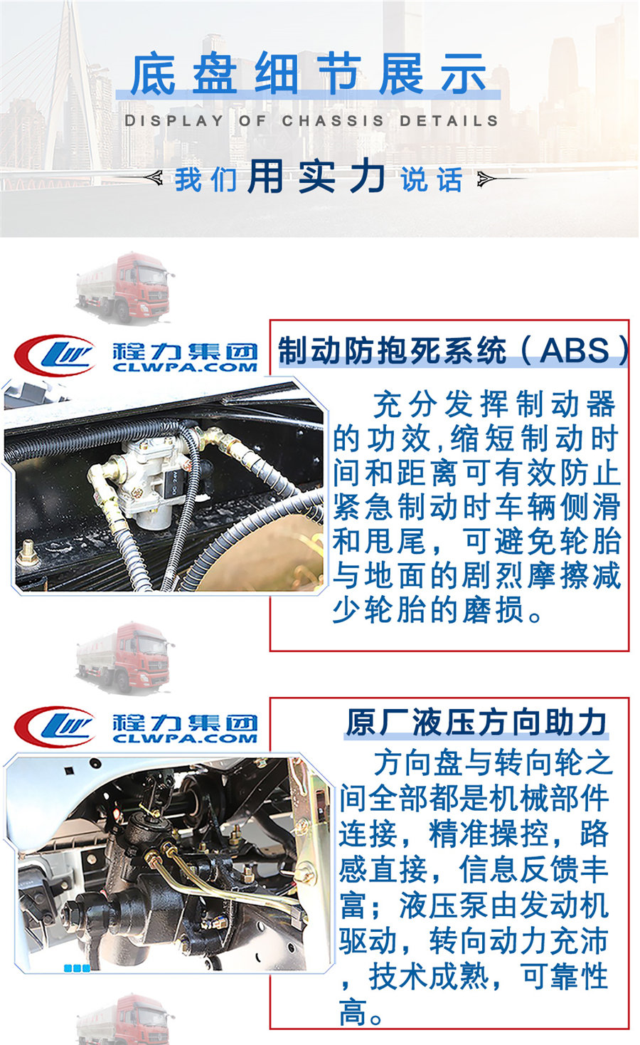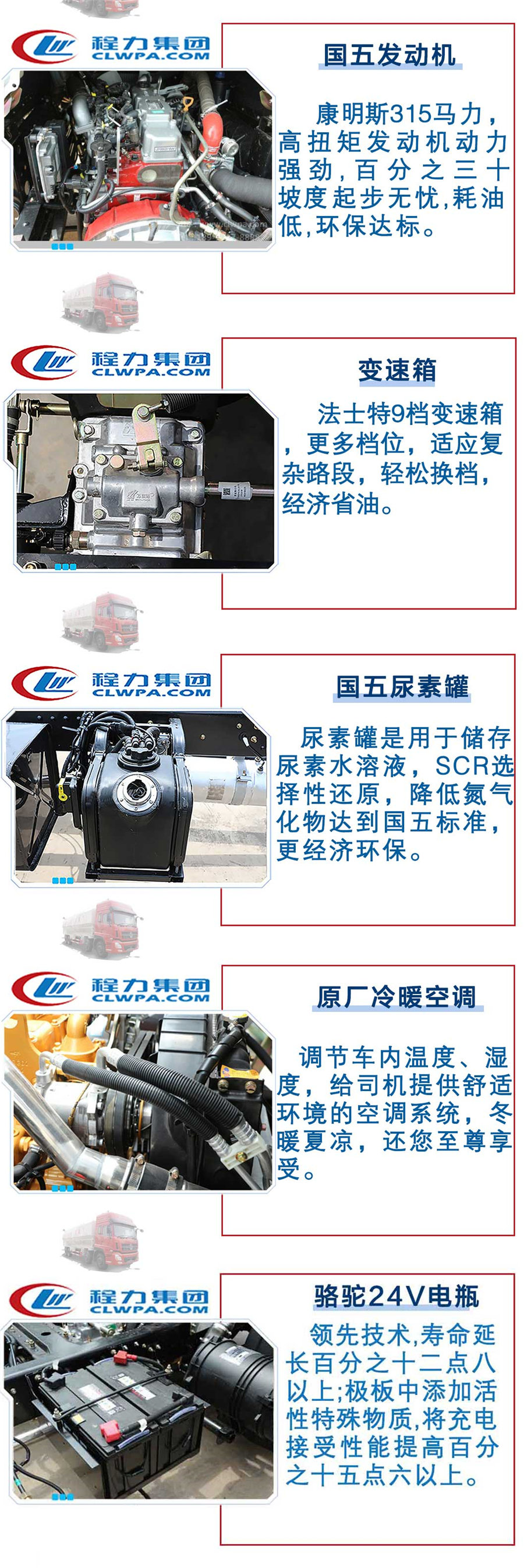 底盤配置:東風天龍原裝底盤,新款豪華帶臥駕駛室,康明斯315馬力發動機,陜齒12檔變速箱, 雙5噸前橋, 10噸后橋,雙層大梁,11.00R20鋼絲胎,1850+4600+1350mm軸距,帶原裝空調. |