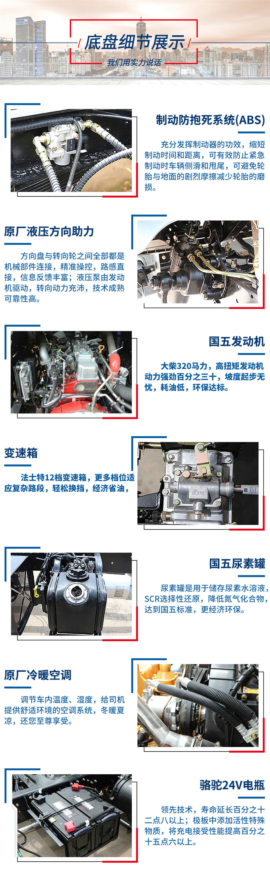 底盤配置:解放前四后八高頂新款駕駛室,大柴320馬力發動機,一汽10檔變速箱,1950+4550+1350mm軸距,11.00R20鋼絲胎,電動門窗,原廠空調,ABS,方向助力,斷氣剎; |